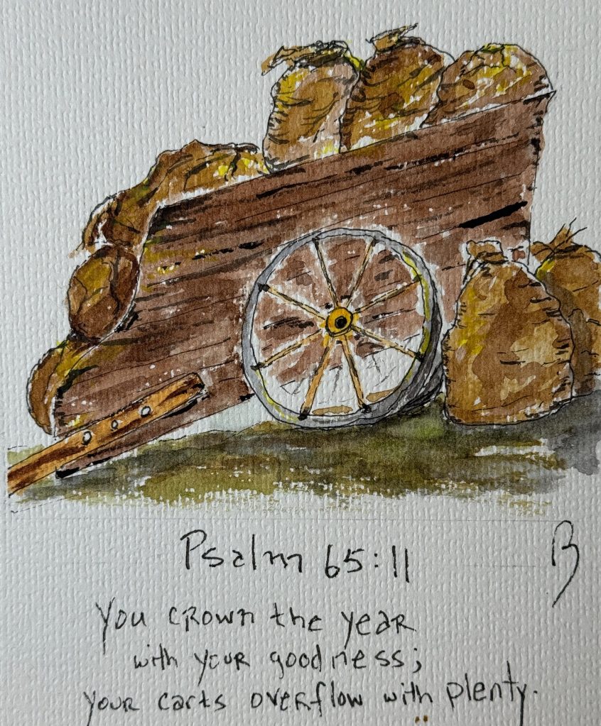This week’s image is from Psalm 65. This is NOT the final illustration, but an early version that I wasn’t too pleased with – but it gave me direction for the final (we’ll share that tomorrow.)
