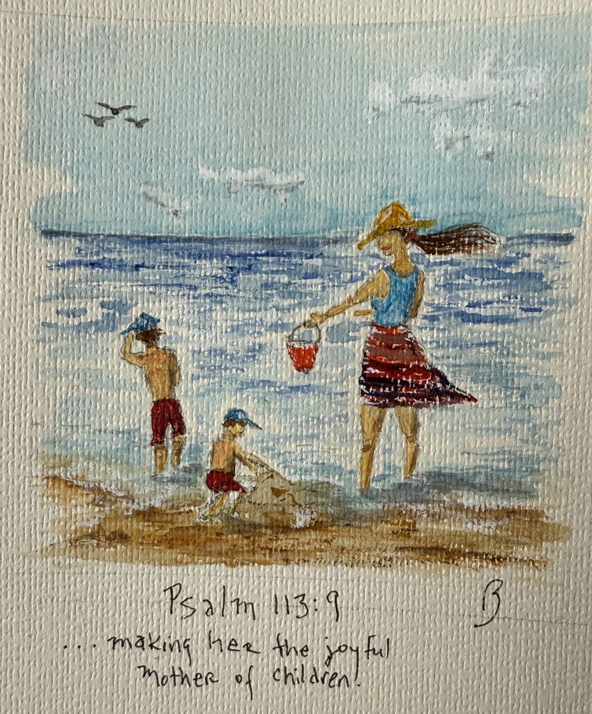 After many attempts, this became the choice for illustration of this verse. I have always enjoyed watching moms at the beach, having fun with their children. Seems like the most joyous they could be! (Some other iterations of this idea in the next few days.)